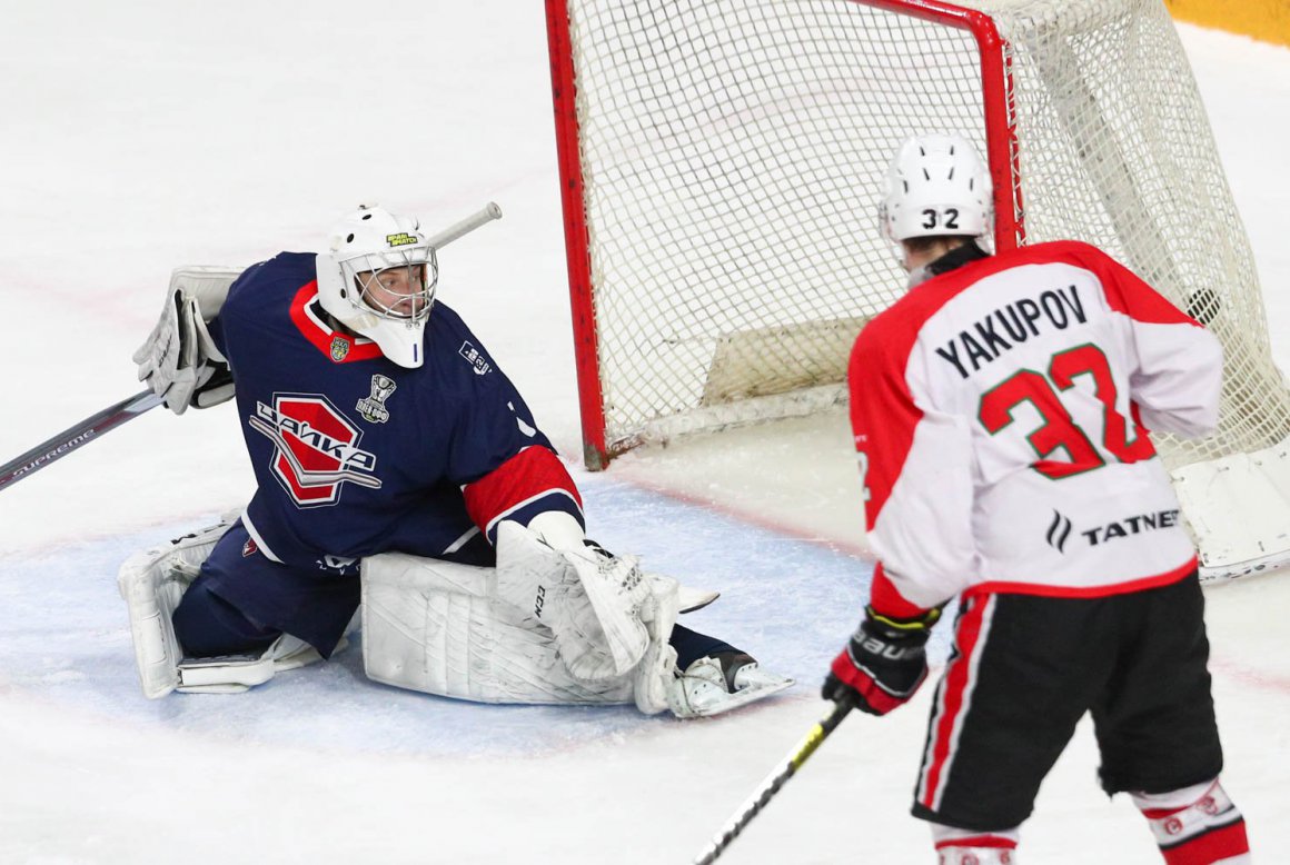 Забегая вперед, можно сказать, что альметьевскую команду в этом матче часто подводила игровая дисциплина. Так, первое удаление альметьевцы получили уже на шестой минуте. Надежно отыграв в меньшинстве, вскоре наши хоккеисты создали опасную атаку, завершившуюся голом. Выиграв вбрасывание в зоне атаки, последовал пас назад на защитника и бросок в сторону ворот. На пятаке дежурил Расим Шакиров, который переиграл вратаря «Чайки». После этого «Спутник» снова остался вчетвером. Это удаление нижегородцы смогли реализовать – 1:1.